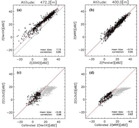 Second, the two vertical pointing radars (VertiX and MRR) were calibrated by comparing them with the ground-based disdrometers (2DVD and PARSIVEL). The correlation and mean bias of the reflectivities between the VertiX (MRR) and the 2DVD (PARSIVEL) were calculated at different altitudes. The altitude with the highest correlation was determined as the optimum altitude from which to derive the mean bias (calibration bias) for each rain event and was repeated for all the rain events listed in Table 2.