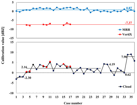 The same procedure was applied to the 36 rain cases from June 2014 to May 2016 and the calibration values (the opposite sign of the mean bias) of the MRR, VertiX, and cloud radar is shown in Figure 7. The calibration values of the MRR and VertiX were stable with time and their averages (standard deviation) were 0.9 dBZ (0.83 dB) for theMRR and −7.4 dBZ (0.48 dB) for the VertiX. The calibration values of the cloud radar were quite variable and their average value was about 2.2 dBZ with a standard deviation of 2.69 dB. The calibration values of the cloud radar with the VertiX and MRR were quite similar (red circle and black circles for eight events in the lower panel of Figure 7). When there was no derived calibration value, the calibration value derived from the nearest day was used.