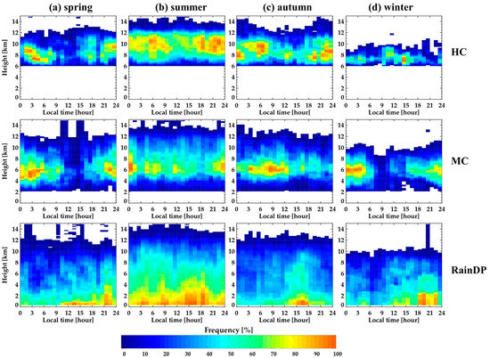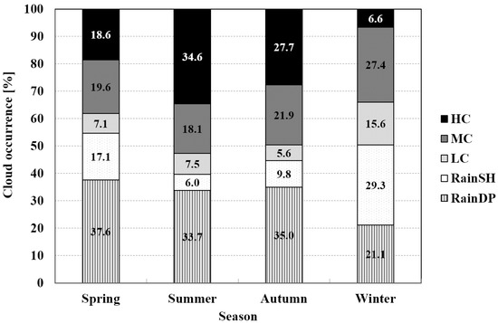 The frequency of cloud occurrence was approximately 15.6% (43.5% of the yearly overall cloud occurrence) in summer, 8.6% (23.9%) in autumn, 5.2% (14.4%) in winter, and 6.5% (18.1%) in spring (Table 5). This result is similar to previous studies that analyzed the cloud frequency in East Asia. According to Cai et al. [41], the occurrence of clouds in summer and autumn was, in general, greater than in spring and winter over China, based on the cloud–aerosol lidar with orthogonal polarization (CALIOP) data. Lee et al. [23] also showed that the occurrence of clouds in summer accounts for the largest proportion of the yearly frequency in Seoul, Korea. Furthermore, the occurrence by cloud types showed the highest value in RainDP (11.8%; 32.9% of the yearly average cloud occurrence), followed by HC (9.3%; 26.0%), MC (7.4%; 20.6%), RainSH (4.4%; 12.0%), and LC (2.9; 8.2%). That is, approximately 45% of clouds were accompanied by precipitation, and the RainSH was approximately 27% of the precipitation. The previous analyses with the shorter period (2–3 months) showed a similar result that the LC containing precipitating clouds was the most frequent (Oh et al. [24] and Ye et al. [25]).
