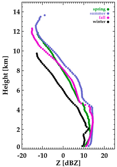 Vertical profiles of averaged reflectivity (Z) with seasons.