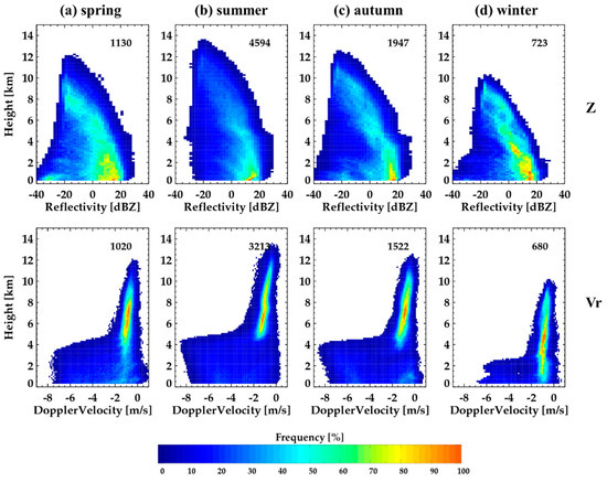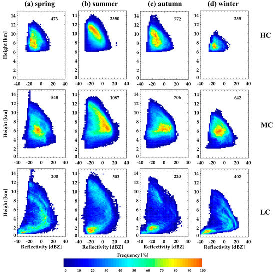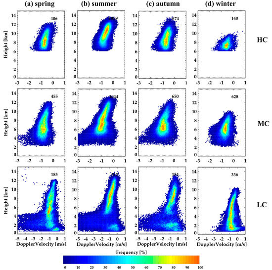 The vertical structure of clouds was examined as CFADs of reflectivity and Doppler velocity for each season (Figure 11). The thickness of clouds was the largest in summer (approximately 14 km, Figure 11b), and the clouds were the thinnest in winter (Figure 11d). Furthermore, clouds occurred most frequently in summer and least in winter. The peak of frequency appeared at the two heights (the HC and LC region) for all seasons with a lower frequency in MC. The upper peak shifted to the lower layers from warm to cold seasons. The two modes (precipitation mode in Z > 0 dBZ and cloud mode in Z < −10 dBZ) were evident except for in summer. The cloud mode was dominant in spring and winter, while the precipitation mode was dominant in summer. The precipitation mode was linked with clouds in MC and HC, showing the downward increase in reflectivity in this dominant precipitation mode. This increase was the largest in the layer of 8–12 km in summer and was linked with the gradual increase (toward larger negative values) in Doppler velocity. A similar trend occurred in the different seasons to a smaller degree (the least increase in spring). Furthermore, the Doppler velocity became almost constant in the layer of 6–8 km in summer. This constant Doppler velocity with increasing reflectivity indicated the existence of a significant updraft in this layer. A similar but less prominent signature was shown in the Doppler velocity in autumn. The dramatic increase in Doppler velocity (toward negative values) was shown in the height of 3 to 5 km for spring, summer, and autumn, indicating the existence of a melting layer. The melting layer was the highest in summer and less prominent in winter, with some signature below 2.5 km.