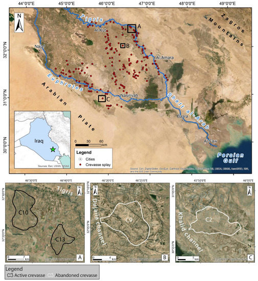 Satellite nadiral view of the study area from TerraColor satellite imagery and distribution of the crevasse splays in the investigated area. Black rectangles indicate the floodplain sectors where the crevasse splays reported and discussed in this work. (A) active crevasse splays along the present Tigris fluvial system (C10 and C13); (B) abandoned crevasse splay along an ancient watercourse (C9); (C) abandoned crevasse splay along an ancient watercourse belonging to the Euphrates fluvial system (C2).