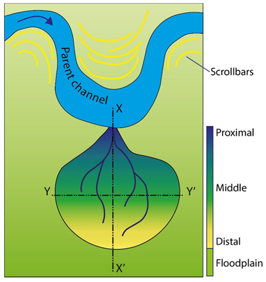 Conceptual sketch of a typica fan-shaped crevasse splays due to a levee break at the external zone of a river belt. The along-dip crevasse sub-division adopted in this work is reported. Direction and terminology for the altimetric profiles elaborated in this work is also shown. Keys: XX’: along-dip direction; YY’ cross direction.