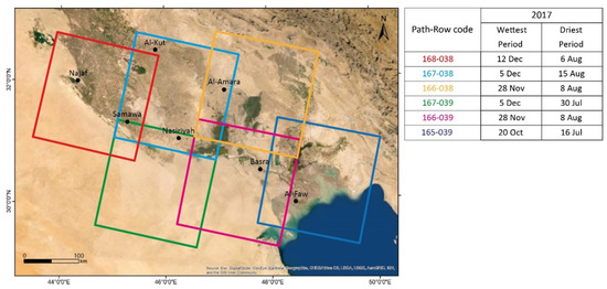 The aim of this study is the application of a combination of different remote sensing techniques for detecting typical landforms association due to the fluvial avulsion process, such as crevasse splays. We use the Lower Mesopotamian Plain (hereafter LMP) as a test site, being an ideal place to apply and verify such a combined approach due to data availability, landscape configuration, and the presence of a well-developed example of active and relict landforms due to the fluvial avulsion process. Indeed, both the occurrence of active and relict crevasse splays and the semi-arid morphoclimatic context with scattered vegetation cover make the LMP an exemplary study area. A visual interpretation of both Google® Earth and TerraColor satellite imagery datasets have been performed for preliminarily detecting and mapping crevasse splays over the LMP, verifying those landform datasets already available in literature for the area [31,32,33]. Terrain analysis based on topographic data from satellite has been successively performed for the study of the microrelief in selected sites. Finally, multispectral analysis and different methods of supervised classification have been carried on Landsat 8 optical imagery. Remote sensing data serves two main goals: (1) detecting and mapping the association of different active erosional and depositional landforms due to the fluvial avulsion process (i.e., rivers, levees, floodplain, crevasse splays); (2) detecting and mapping relict landforms, such as abandoned river courses, levee breaks, and associated inactive crevasse splays.