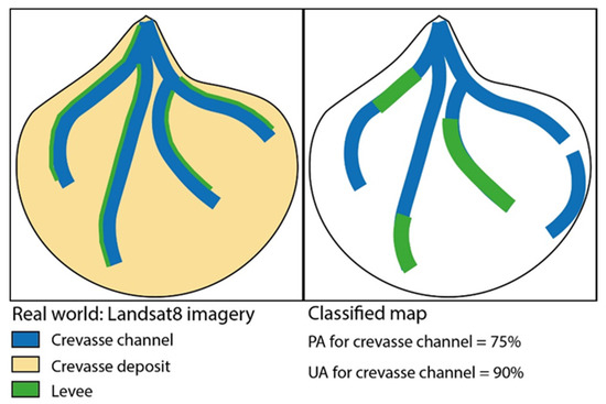 Finally, specific target features have been submitted in the Supervised Classification (SC). In particular, in order to recognize crevasse splays and for focusing exclusively on them, the target features are delineated like Regions Of Interest (ROIs). The target feature of a crevasse splay has been distinguished into three main sub-features in order to better specify the ROIs, where the spectral signature has been extracted: (i) active and abandoned channel; (ii) active levee; (iii) active and abandoned deposit. The ROIs have been extracted on the active C10 and the abandoned C2, which sub-features are perfectly recognizable; the calibration ROIs for the SC are composed by 22 records for both the wettest and the driest periods. In the SC, four different methods have been adopted and their performance has been estimated: (1) Mahalanobis; (2) Maximum Likelihood; (3) Minimum Distance; (4) Spectral Angle Mapper (SAM) [70]. Different iterations have been done varying the specific thresholds for each classification method, but only the most accurate results have been described and discussed in this study. Despite the unavailability of a definite method to assess the absolute accuracy of image classification for remote sensing Earth observation applications, the computation of a confusion matrix is a widely accepted method to determine the relative accuracy of classifications, using the previous identified ROIs for ground truth [71]. Each element in the major diagonal of the confusion matrix represents the number of pixels that are correctly classified for a class x, whereas the elements out of the major diagonal are the number of pixels that should be in class x but which are incorrectly classified as class y. Certainly, if all the image pixels are correctly classified, we should then have a diagonal confusion matrix where all non-diagonal elements become zero [70,71]. The confusion matrix gives back the Overall Accuracy (OA) and the Kappa coefficient (K). The first one is the percentage of the correct classification and the second one is the statistical measure of classification accuracy and quality. The maximum value of K is 1, representing the perfect agreement between the classification and the reference data, while K becomes 0 for no agreement [71]. In light of the discouraged use of the Kappa metric in the remote sensing community for validating a classification [72], the User Accuracy (UA) and the Producer Accuracy (PA) have also been taken into consideration. The first one is the probability that a value predicted to be in a class x really is in that class, (i.e., how often the class x on the map occurs on the ground). The PA is the probability that a value in a given class was classified correctly, signifying how often the real features on the ground are correctly shown on the classified map [73,74]. The UA and PA for any given class usually are not the same. Figure 4 shows an example where the 75% of the crevasse channels occurred on the ground have been correctly classified (i.e., PA = 75%) whereas some of them are wrongly classified as “levee”. Anyway, the class “crevasse channel” perfectly corresponds to the channels on the ground, except for a “fake-channel” on the right side, thus only the 90% of the classified areas as “active channel” are actually a channel (i.e., UA = 90%) [75].