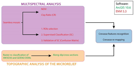 In order to identify Earth surface processes and associated landforms and, eventually, correlated archaeological and anthropic features, especially where political conflicts/warfare occur or the climate conditions prevent detailed fieldworks, the use of remote sensing techniques give a relevant support ([23,24,25,26,27,28,29] and references therein). Moreover, wide extensions of the areas under investigation encourage the application of these techniques. Remote sensing and multispectral imagery have notable potential for detecting changing fluvial systems and reconstructing the drainage networks in areas characterized by low topographic relief, especially when landforms are no longer visible on the ground, such as those belonging to relict waterscapes [23,30]. In particular, for detecting processes and landforms within lowland areas, the exclusive use of remote sensing techniques based on digital elevation datasets can be difficult.