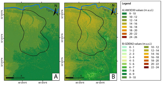 The LMP is the southernmost sector of the MP, a rather flat area with a low topographic relief comprised between the latitude of 32°30′00″ N and 29°50′00″ N. LMP is bordered by the Zagros Mountains to the north-east and by the Arabian Desert to the west (Figure 1). The Tigris and Euphrates rivers are the main watercourse, occupying the marginal sectors of the Mesopotamian alluvial plain both with a northwest-southeast flow direction, parallel to the plain axis [34]: the Euphrates flows in the western side while the Tigris in the eastern sector. These rivers join near Basra, forming the Shatt-Al-Arab River, which mouths in the Persian Gulf, after about 170 km, forming an estuary with a wide marshland area [34,35]. Fluvial processes mainly characterize the entire LMP and many active and relict fluvial landforms widely occur in the area [31,34,36,37]. Fluvial avulsion was relevant for the development of the Mesopotamian civilization [31] and the evolution of such a fluvial process is due to different processes: (i) annexation, whereby an existing channel is (re-)occupied; (ii) diversion, through which a flow is deviated into the adjacent flood basin with the consequently deposition of a sediment wedge expanding downstream; (iii) incision, whereby a new channel is scoured in the floodplain [5,38].