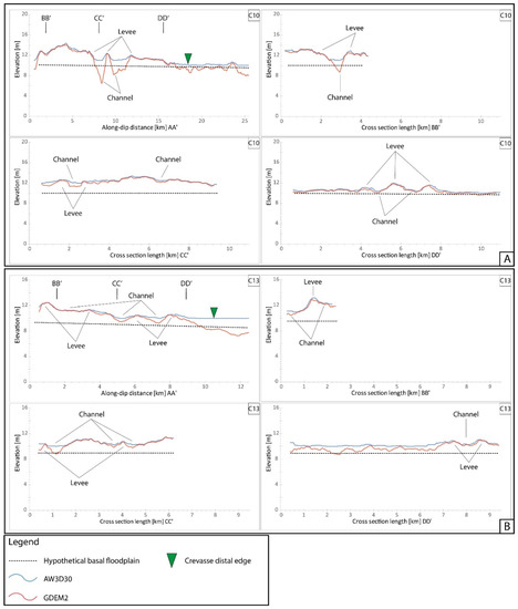 Example of active (C10, C13) and abandoned (C2, C9) crevasse splays recognized in the area. The traces of altimetric profiles shown in Figure 8 and Figure 9 are reported: AA’: along-dip profiles, BB’: cross-direction profiles of the proximal sector, CC’: cross-direction profiles of the middle sector, DD’: cross-direction profiles of the distal sector.