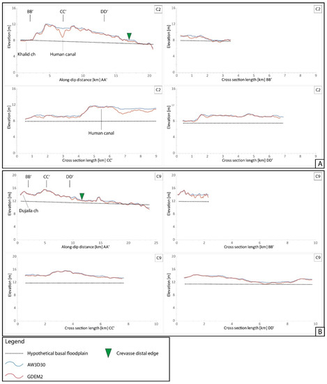 The preliminary inspection of the Google® Earth and TerraColor imagery allowed to identify several crevasse splays, either along the active fluvial system, especially on the right bank of the Tigris Rivers, or along abandoned channels. In the present research, four examples of crevasse splays have been selected based on their size (> 50 km2) and their state of activity (two examples among the recognized active crevasses and two among the abandoned ones). The preliminary inspection leads to identify the abandoned Kut-Al-Hayy East airbase in the middle-distal sector of C9. The area of this airbase is about 18 km2 and occupies only the 25% of the entire C9, with a negligible “noise” in the analysis of the entire landform (Figure 6). The multi-channel system, typical of crevasse splays, is the most recognizable feature in the optical imagery and its identification favoured the planar delimitation and mapping, especially for the active forms (Figure 6). The topographic analysis really improved the preliminary mapping favoured by the relevant differences in spatial distribution of the deposits between active and abandoned crevasse splays considering the along-dip and cross directions (Figure 6 and Figure 7). Moreover, the topographic analysis leads to a preliminary estimate of the depth of the deposits through the projection of the floodplain backward, up to the proximal sector of each along-dip section.