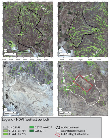 The most evident difference in the NDVI computation is the occurrence of vegetation on active and abandoned crevasses, leading to discern their state of activity. Bearing in mind the influence of rainfall seasonality, the most reliable results were obtained with the images of the wettest period. Nevertheless, both examples of active crevasses (i.e., C10 and C13) show higher NDVI value than the abandoned ones (i.e., C2 and C9). Indeed, considering the NDVI during the wettest period, the highest values occur along the crevasse channels in the proximal and middle sectors of C10 (Figure 10). Otherwise, the NDVI values are higher in the southern part of C13, where the crevasse channels are largest. The occurrence of vegetation in the abandoned C2 and C9 is mainly due to the crops and human canals surrounding the crevasses.