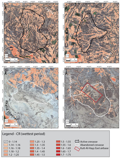 Spatial distribution of the CR, during the wettest period, for the active (C10, C13) and the abandoned (C2, C9) crevasse splays.