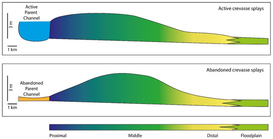 - Burns, C.; Mountney, N.P.; Hodgson, D.M.; Colombera, L. Anatomy and dimensions of fluvial crevasse-splay deposits: Examples from the Cretaceous Castlegate Sandstone and Neslen Formation, Utah, USA. Sediment. Geol. 2017, 351, 21–35. [Google Scholar] [CrossRef]