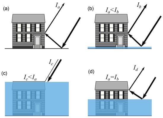 Simplified scheme of the of backscattering intensity mechanism and the effect of the inundation depth and building height in the backscattering magnitude. (a) double bounce mechanism. (b) specular reflection and double bounce mechanisms over a large wall area (). (c) specular reflection and double bounce over a small wall area (). (d) specular reflection and double bounce with backscattering intensity equal to the case shown in (a).