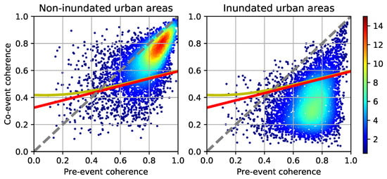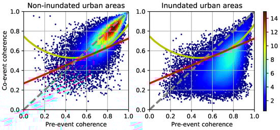 A bidimensional feature space is constructed from the SAR images. One feature denotes the interferometric coherence computed from the two pre-events SAR images, and the second feature denotes the interferometric coherence computed from the post-event and the closest pre-event images. The former is termed as pre-event coherence and the latter co-event coherence. It has been pointed out that interferometric coherence is effective in identifying floods in urban areas [], and it is independent of the orientation angle of buildings []. Furthermore, results from [] show that coherence is more robust than difference of intensity to identify floods in urban areas. Figure 1 depicts the RGB color composite of the co-event (R) and the pre-event (G and B) coherence images for all the test areas. All the images have approximately 14-m resolution. Figure 3 depicts the feature samples of flooded and non-flooded built-up areas associated to the 2018 heavy rainfall (i.e., samples collected from the TR-set of SAR images). The flooded samples were collected from the area outlined by GSI, shown as yellow polygons in the inset of Figure 1. A total of 15,058 samples were collected at pixels labeled as built-up by the Jaxa’s land use map. The same number of non-flooded built-up samples were extracted randomly from the blue polygon shown in the same inset. The color marks in the scatter plot represent the density samples. Note that, for flooded samples, the co-event coherence is lower than the pre-event coherence; whereas, non-flooded samples are clustered around the identify function (i.e., pre-event coherence = co-event coherence).