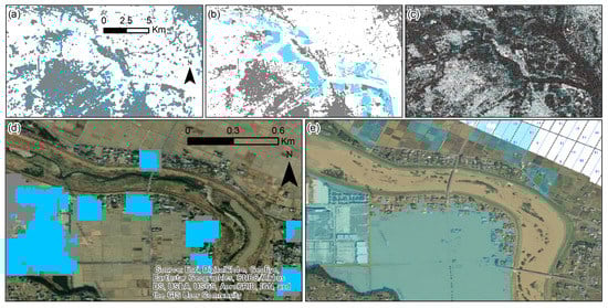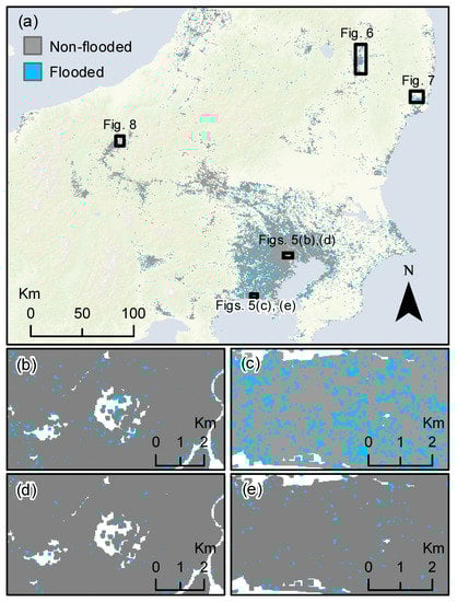 The city of Saitama, Tokyo, was also reported as flooded (Figure 9). Saitama is located in the PR1, which contains the largest level of misclassifications. A closer look showed that most of the flooded built-up areas consisted of low-dense residential buildings (Figure 9d,e). Such residential areas were not completely covered in the land use map provided by Jaxa, and thus, it was not detected in the predicted flood map.
