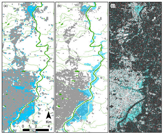 Closer look of the affected area in the city of Nagano, Nagano Prefecture. (a) The predicted flood map. (b) The reference flood map provided by GSI. (c) The RGB coherence color composite. Their locations are indicated in Figure 5a.