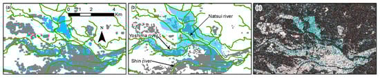 Closer look of the affected area in the city of Iwaki, Fukushima Prefecture. (a) The predicted flood map. (b) The reference flood map provided by the Iwaki city. (c) The RGB coherence color composite. Their locations are indicated in Figure 5a.