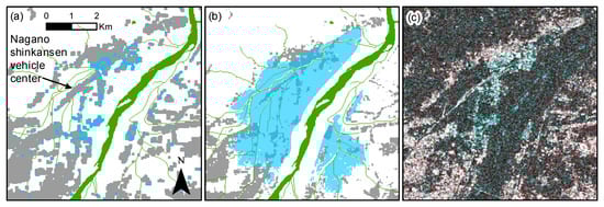 Despite the observed noise, floods produced by river overflow were identified because of their large extent. Figure 6, Figure 7 and Figure 8 show a comparison of the predicted and reference flood maps at the cities of Koriyama, Iwaki, and Nagano, respectively. The RGB coherence color composite maps are shown as well. Recall the reference flood map includes built-up and vegetation areas, whereas the predicted flood map focuses only on built-up areas. A good agreement between the predicted and reference flood maps is observed for the Koriyama city (Figure 6). Regarding the city of Iwaki, a partial agreement is observed (Figure 7). The floods in Iwaki city are associated with the overflow of Natsui, Yoshima, and Shin rivers. The predicted floods produced by the Natsui and Yoshima rivers are consistent with the reference map. However, a poor agreement is observed in the floods produced by the Shin river. The main reason for the disagreement lies in the inundation depth. Evidence from local inhabitants shows that the inundation due to the Shin river was very shallow [], whereas the inundation due to the Natsui river was considerably deeper []. No evidence was found for the Yoshima river. Regarding the flood in Nagano city (Figure 8), the predicted flood area is smaller than that reported in the reference map. The reason is related to the acquisition date of the post-event image. Nagano city is located within the PR3 test area, from which the post-event image was acquired five days after the floods. During this interval, the inundation extent has shrunk. For instance, it was reported that the water bodies at the Nagano shinkansen vehicle center (Figure 8a) were drained by 15 October 2019 [], two days before the post-event image was acquired.
