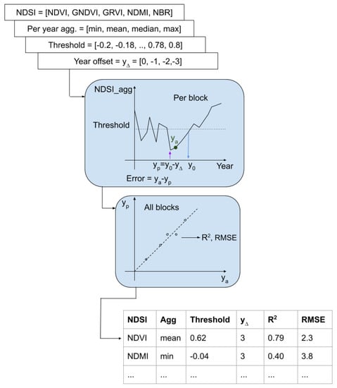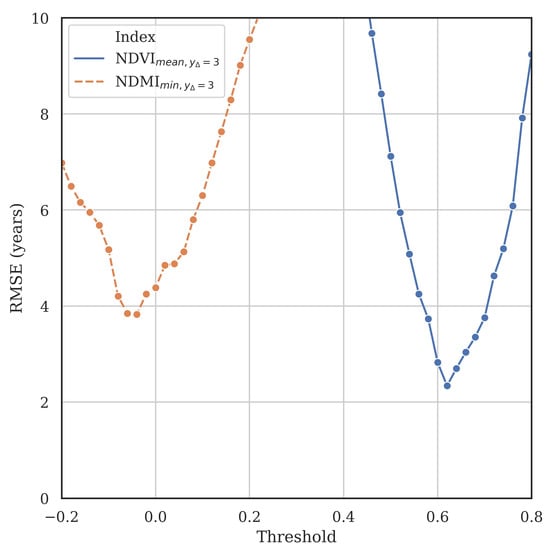 A total of parameter sets were tested (five NDSIs, with four yearly aggregations, four year offsets × 51 thresholds) to find the best set using the threshold method. The plant year prediction RMSE of two example parameter combinations ((NDMI,) and (NDVI,)) with swept NDSI threshold are shown in Figure 4. Each point on each curve summarizes the prediction RMSE for the 95 blocks.