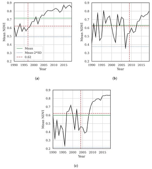 Mean NDVI per year for three macadamia blocks. Actual planting year is indicated by the vertical red line, the selected threshold of by the horizontal red lines, time-series mean by the green lines, and mean − 2 × SD by the blue lines. One example from each of the three regions is shown: (a) Macksville, (b) Ballina, and (c) Bundaberg.