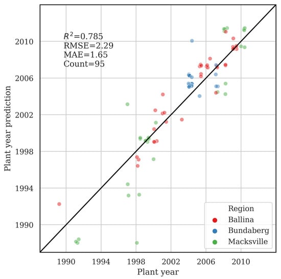 To assess stability of the optimal parameters considering regional differences, the planting year prediction algorithm search was run for the blocks from each of the three study regions independently. The best three parameter sets from each region are shown in Table 3. In all cases, the best parameter set was exactly the same as when the data from all regions was pooled, NDVI with a threshold of 0.62. This is equivalent to training a model on a subset of regions, and holding out a test set from a separate region. The consistency of the selected optimal parameter set gives confidence in the ability of the algorithm to be generalized to other areas. The RMSE was 2.8, 2.5, and 1.7 years for the Ballina, Bundaberg, and Macksville regions, respectively.