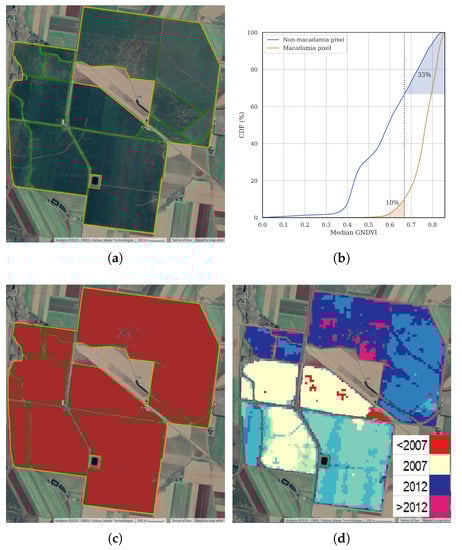 The 2019 Sentinel-2 pixels from the blocks used in this study were sampled (productive areas), as well as areas outside the blocks but still inside the features (non-productive areas). Figure 6b shows the cumulative density function of the annual median GNDVI pixels inside and outside the macadamia blocks. GNDVI values greater than 0.668 include 90% of the productive area pixels (10% omission error). On the other hand, the commission error is 33%, which is the proportion of non-macadamia pixels included. A similar search was run using all NDSIs to find the threshold giving an omission error of 10%. GNDVI was the optimal NDSI and threshold, other NDSIs gave larger commission errors.