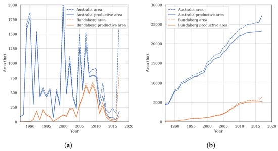 Estimates of macadamia area in all Australia and just the Bundaberg region, both with and without the productive area mask applied. (a) Planted per year and (b) cumulative area.