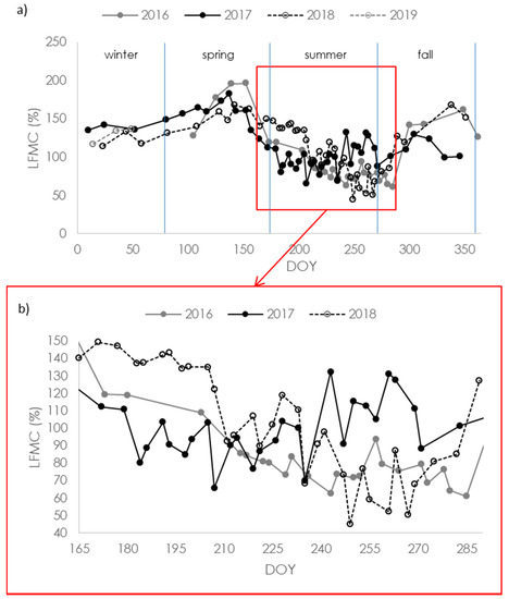 LFMC of C. ladanifer monitored in the field: (a) from April 2016 to February 2019 and (b) during the fire season (15 June (DOY = 166) to 15 October (DOY = 288)).