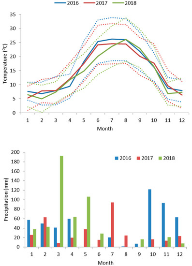 Comparison of the temperature regime (average maximum, mean and minimum values) and precipitation distribution between years during the study period.