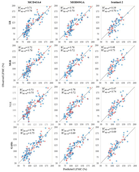 Observed vs. predicted values of LFMC using the best empirical model obtained for each type of surface reflectance source and method used (LR, MLR, NLR, and GAMs). Blue and red circles depict calibration and validation data, respectively.