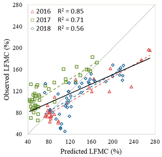 Observed vs. predicted values of LFMC obtained from RTM with correlation lines for the complete dataset (continuous black) and each year (dashed color lines).