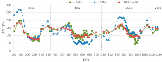 Comparison of C. ladanifer LFMC values from field monitoring and estimations from RTM and an empirical model (NLR).
