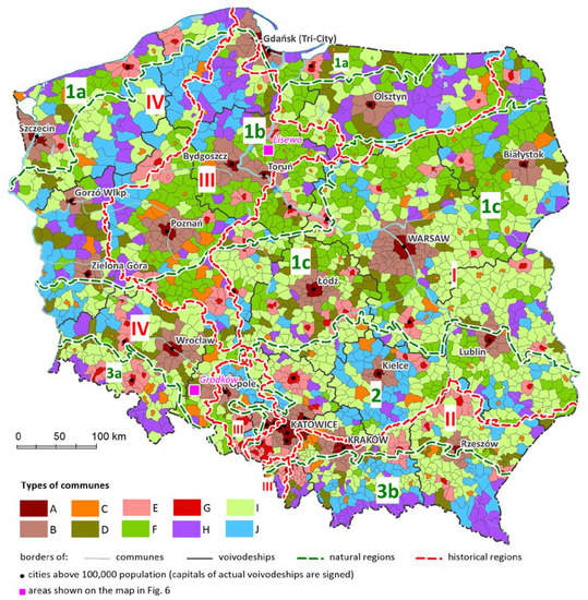 Division of Poland into natural regions, historical regions, and types of communes, used in the study. Explanations: Types of communes according to the classification of P. Śleszyński and T. Komornicki []. A—functional urban areas of voivodship capitals; B—their external zones; C—functional urban areas of subregional centres; D—their external zones; E—multifunctional urban centres; F—communes with developed transport functions; G—communes with other developed non-agricultural functions (tourism and large-scale functions, including mining); H—communes with intensively developed agricultural functions; I—communes with moderately developed agricultural functions; J—extensively developed communes (with forests or nature protection areas). Types of natural regions according to the latest physio-geographical regionalization of J. Solon et al. []. Abbreviations on the map: 1a—lowlands: Coastlands; 1b—lowlands: Lakelands; 1c—other lowlands; 2—uplands and Northern Subcarpathians (including basins); 3a—mountains—Sudetes; 3b—mountains—Carpathians. Historical regions: I—Congress Kingdom (with district of Białystok); II—Galicia; III—Greater Poland, Gdańsk Pomerania (Kashubia), and Upper Silesia; IV—Western and Northern Lands.