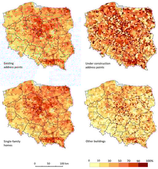 The differences in occurrence of address points and buildings according to the historical regions of Poland are presented in Table 3. With regard to existing addresses and single-family houses it turns out that higher indicators of the share of objects outside class 1 (in practice it mainly refers to subclass 11) pertain to Galicia (south-east Poland, i.e., in the vast majority this region is the area of current Małopolskie and Podkarpackie voivodeships). For the address points it is 37.0% and for investments under construction—as much as 58.5%.