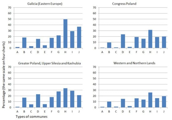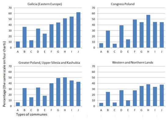 Comparisons according to the historical regions juxtaposed with the functional types of communes are presented in Figure 3 (for single-family buildings) and Figure 4 (for addresses for objects under construction), maintaining, for comparative purposes, the same vertical scale of 0%–70%. Agricultural municipalities (type H) are particularly distinguishing in Galicia but in principle in all the historical regions of Poland they have the highest share for the observed incompatibilities among all the types.
