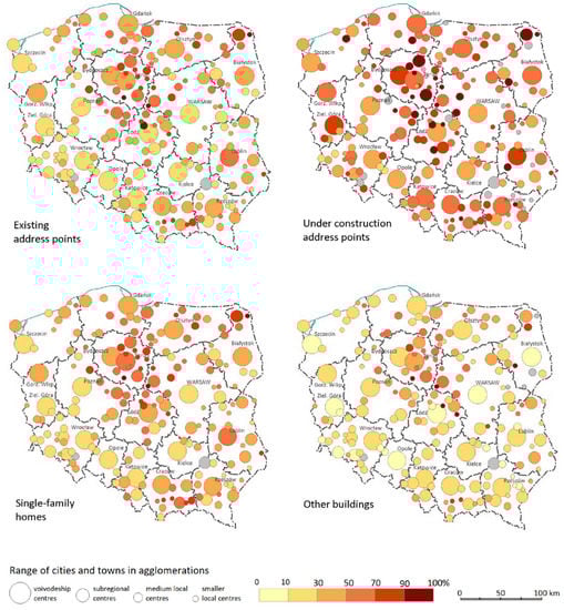Outside class 1 of CLC 2018—artificial surfaces, there were 33.9% of the existing address points, 46.6% of those for buildings during construction and forecasted for construction, 35.6% of single-family houses, and 9.2% of other buildings. Thus, the differences are very large, especially for new investments under construction. It means that in a very large degree they are built outside the compact built-up areas. Even if some share of new buildings (with a new address) is “adjacent” to the CLC 2018 patches of class 1 (including the sub-class 11—urban fabric), then the scale of dispersion is still very high. The fact that over 1/3 of existing single-family houses remains beyond class 1 in a very suggestive manner illustrates the extremely problematic structure of Polish settlement.