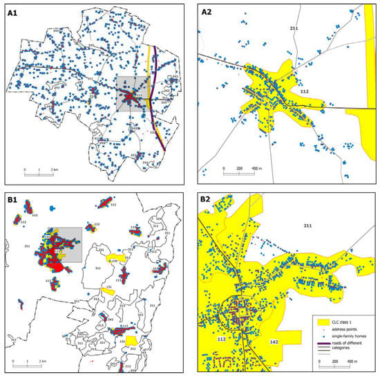 Co-existence of centroids of single-family houses, address points, and CLC 2018 delimitations: (A1, A2) Lisewo municipality (Kujawsko-pomorskie voivodeship); (B1, B2) Grodków municipality (Opolskie voivodeship). Source: Based on CLC 2018 data (acquired from GIOŚ), BDOT, and PRG (acquired from GUGiK).