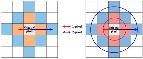 For the spatial variability study, the pixels within the spatial range were selected and these valid datasets were totally averaged for comparisons with data from the center of pixels. In addition, the correlation between the compared datasets and the scientific data at the center of spatial range was calculated. To focus on the Asia region, satellite data within 20–50 °N and 90–150 °E were selected for the latitudinal and longitudinal spatial ranges, respectively. Figure 2 shows the schematic figures for the spatial variability estimation of AOD from MODIS. Because the variation in the spatial resolution of MODIS AOD is negligible, the 5-pixels were selected if the spatial range was in the 10 km range, as shown in the red pixels. Furthermore, the 13-pixels (red and blue) were also used in the average calculation if the spatial range was 20 km. To identify the spatial variability with respect to the spatial range, the spatial range was assumed to change from 10 to 100 km radius with every 10 km interval. This study focuses on the quantitative consistency with spatio-temporal changes in the year 2016. Therefore, the spatio-temporal variabilities for specific products were estimated by the correlation coefficient, slope, and intercept from the linear regression analysis.