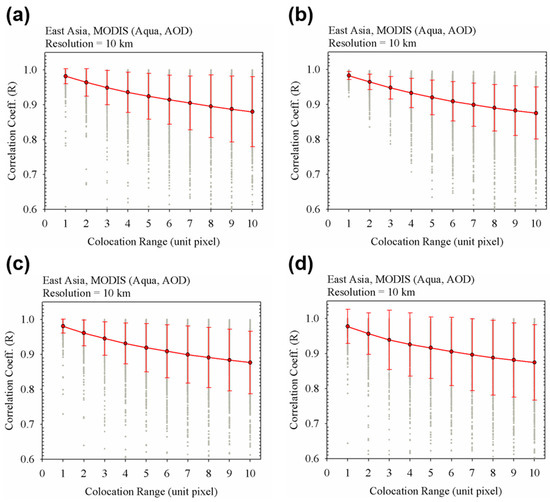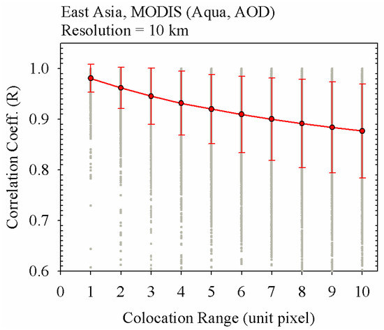 For the spatial variability of AOD from the satellite measurements, the distribution of the correlation coefficient (Rd) was used. For the Rd, each R value was estimated in a single granule in 5-min intervals. Based on each R value, the Rd value was finally calculated to the mean and standard deviation of R values with respect to the colocation range. Figure 4 shows the Rd value as a function of the colocation range. Focusing on each correlation coefficient value with its respective granule, the R value largely varies by up to ~0.5. The large variation of correlation coefficient in each granule was partially caused by the low AOD values in the background areas, such as the ocean areas. However, statistically estimated mean Rd was higher than the respective R value. The mean Rd ranged from 0.981 in 10 km colocation range to 0.877 in 100 km colocation range. As the colocation range increased, the mean value of Rd slightly decreased as the standard deviation of Rd increased. In addition, as the colocation range increased, the tendency to decrease the mean of Rd and increase the standard deviation of Rd slowed together.