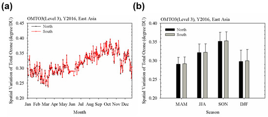 However, several previous studies have shown that the TCO suddenly changes during winter and spring seasons due to the enhancement of ozone concentration at the upper troposphere/lower stratosphere (UT/LS) in the jet-stream outflow regions [71,72,73]. In East Asia, the UT/LS ozone enhancement frequently occurs, and sudden changes of TCO have frequently been observed based on the daily observation datasets from ground-based measurements [71]. This phenomenon also affects the spatio-temporal variability of TCO. For this reason, the spatio-temporal variability, considering seasonal change, is also executed to consider the TCO variation due to the UT/LS ozone enhancement.