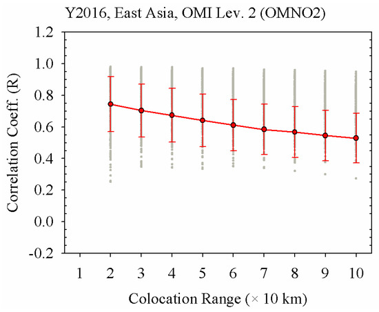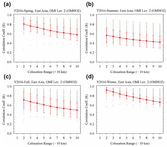 The Rd value for the TCN as a function of colocation range is shown in Figure 7. Because of the pixel size of OMI, there were no cases within 10 km for the colocation range. In a similar way to the Rd distribution for AOD, a significant tendency to decrease was found with an increasing colocation range. However, the absolute value of R was always smaller than those of the AOD cases. For all cases of the colocation range, the R value did not exceed 0.81. For this reason, it is difficult to apply the threshold of the spatial colocation range for aerosol to those for NO2. Focusing on the seasonal variation, the Rd value has strong seasonal variability, as shown in Figure 8. Because the photo-chemical reaction vigorously activates in summer [74], the spatial variability of NO2 is enhanced during the summer season. In addition, the size of areas in high concentration of NO2, near the downtown or industrial region, may be reduced due to the photochemical reaction change. For this reason, the R value is up to 0.569 (colocation range: 20 km). Otherwise, the R value is from 0.666 (colocation range: 100 km) to 0.925 (colocation range: 20 km) in wintertime. Therefore, we have to consider the spatial variability of NO2 because of the strong seasonal variations and inhomogeneity near the emission source regions.