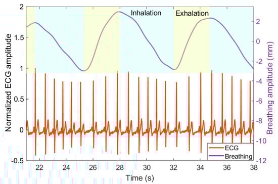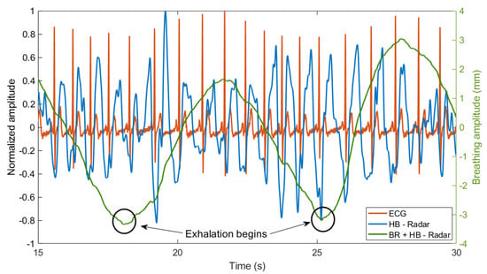 Moreover, several diagnostic indicators can be extracted from this waveform, for instance, the heart rate variability (HRV). It is a widely used as a non-invasive tool to assess the autonomic nervous system (ANS) activity, being used as a biomarker of some disorders, such as sleep apnea, sudden cardiac death, diabetic neuropathy or stress [38,39,40,41,42]. The concept behind the HRV was firstly introduced by Stephen Hales in 1733 [43], when he noticed a variation in the arterial blood pressure and time length between beats during the respiration cycle of horses. However, it was not until 1847 when this phenomenon was documented by Carl Ludwig [44], stating an increase in the heart rate during inhalation and a decrease during exhalation. Nowadays, this fact is known as respiratory sinus arrhythmia (RSA), and it proves that a coupling between breathing and heartbeat exists. Figure 1 illustrates the heart rate variation due to the breathing process, where it can also be observed the ECG amplitude modulation due to the breathing [45]. Moreover, it shows how during inhalation the subject chest volume increases, reducing the distance between the radar setup and the region measured, which is represented with negative amplitude values. Additionally, the HRV and RSA provide diagnostic capabilities to identify respiratory disorders such as central sleep apnea, chronic obstructive pulmonary disease or asthma, and refine diagnostic procedures [20,46,47,48].