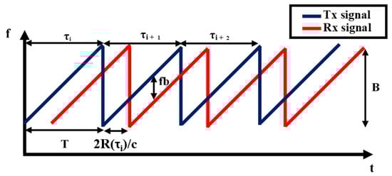 The beat signal follows a sinusoidal waveform with a frequency known as beat frequency . Identifying terms in the previous equation, , thus, the beat frequency is proportional to the target range [50]. On the other hand, the phase of the beat signal is denoted as , and contains information about the target range. Lastly, the term represents the residual video phase (RVP) [50], which is found to be negligible and can be ignored, since it is proportional to .
