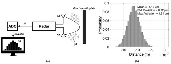 (a) Diagram of the measurement set-up for phase stability characterization, where the radar aims at a static metal plate. (b) Recorded histogram of the distance displacements due to phase shifts according to .