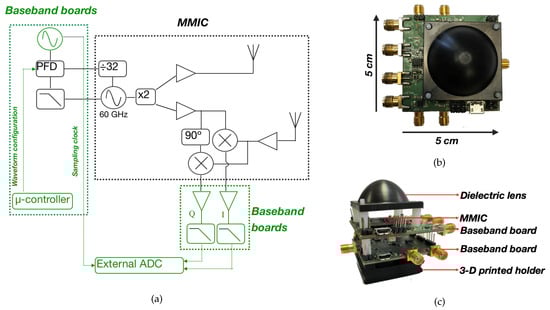 (a) Diagram of the radar’s RF and baseband architecture. Items in green have been modified from the original commercial version. (b) Photograph of the sensor: top view. The connectors on the sides of the sensor are various I/Q, clock and trigger outputs. The microcontroller includes a USB connector to receive waveform configuration orders from a PC. (c) Photograph of the sensor: front view.