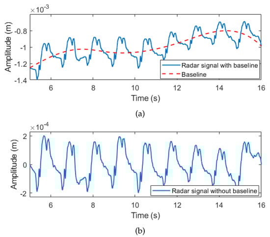 (a) Radar signal obtained for an apnea measurement and its baseline. (b) Radar signal after removing the baseline using the EMD algorithm.