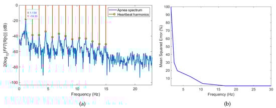(a) Spectrum of a measurement in apnea conditions and the harmonics passing through the filter. (b) MSE expressed in % of the reconstructed heartbeat signal varying the filter cut-off frequency, . is the number of harmonics passing through the filter bandwidth and is the fundamental heartbeat frequency.