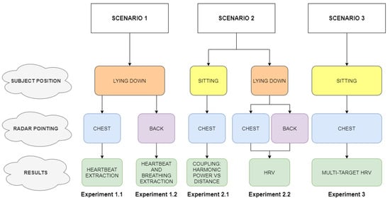 This section shows the results obtained from the three different experiments carried out, a scheme of the experiments carried out is presented in Figure 10. The first experiment shows the capability of the proposed approach to separate the breathing and heartbeat signals. The second one proves the existing coupling between the breathing and heartbeat signals, also showing that our approach is able to extract an estimate of the HRV sequence in a standoff configuration with different body orientations: anterior and posterior views. And finally, the third experiment has been developed to reproduce a real-case scenario, where two persons are monitored simultaneously.