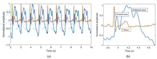 As previously stated in [26], the extracted heartbeat waveform depends on the orientation of the radar, so the beat shape can lightly differ between measurements taken using the anterior or posterior view. However, the characteristic points providing significant diagnostic information can be easily identified, being congruent with the prototypical shape shown in [57] (Figure 12b). The radar sequence presents the prototypical plot of the arterial pulse waveform, which is composed of a forward and backward wave. The forward wave represents the traveling wave generated by contraction of the left ventricle of the heart, while the reflected wave is the traveling wave generated by reflection from peripheral arteries [58].