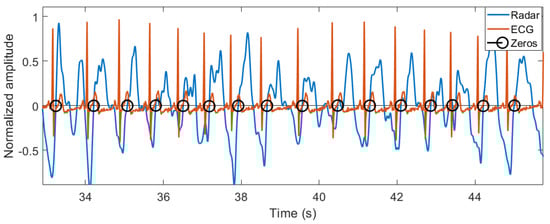The next experiment represents a more realistic scenario: a 22-year-male is lying down, breathing normally, and the radar is placed 1 m away from the subject, pointing to its back (see Figure 11b). Figure 13 shows in green the chest displacement obtained with the radar, where the heartbeat overlays the breathing waveform, which is the dominant component due to a 10:1 amplitude ratio between both signals. Thus, the chest displacement roughly corresponds with the breathing signal. Moreover, the normalized heartbeat (in blue) and the reference ECG (in red) are also displayed. These results evidence that, despite the heartbeat waveform appears with an amplitude distortion for some periods, there is a clear synchrony between the ECG and the heartbeat waveform. Besides, Figure 13 shows the modulations in both the amplitude and in the pulse period sequence of the ECG, which are highly correlated with the breathing: Breathing directly modulates the amplitude of the ECG; and, exhalations increase the pulse periods, whereas inhalations decrease the pulse periods. These effects were expected and have been widely analyzed in the literature [45,59].